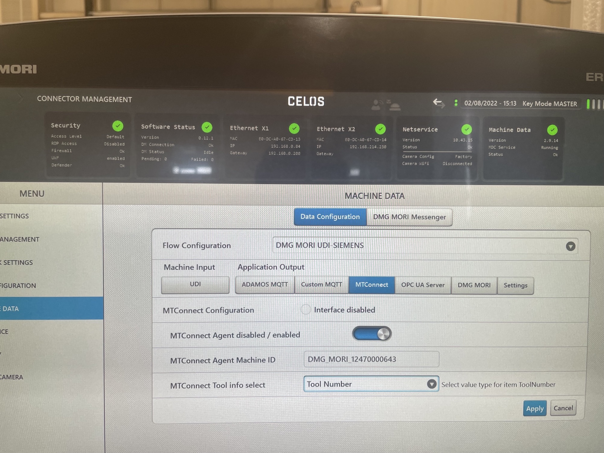 MTConnect is installed on new DMG Mori machines as standard. On a Celos control it must be enabled for use manually. To do so, navigate to the CELOS Connector Management application on the CELOS screen and click Machine Data on the left side.